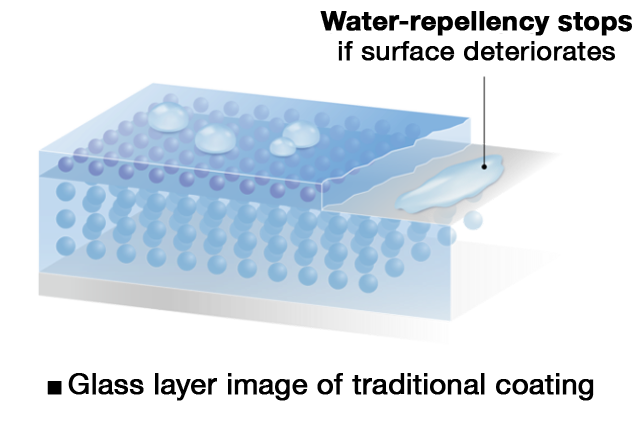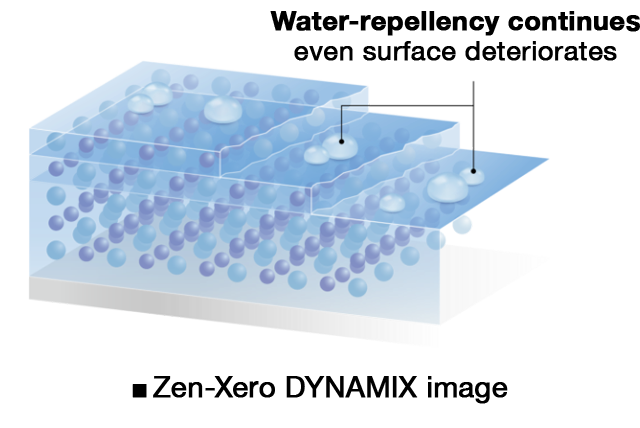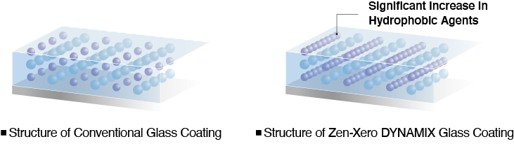 In traditional water-repellent glass coatings, the water-repellent groups form on down over time. Zen-Xero DYNAMIX takes a different approach by integrating water-repellent groups uniformly throughout the glass coating. As a result, even as the coating diminishes, the water-repellent groups remain present, ensuring sustained water-repellent performance.